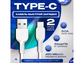 Кабель для зарядки USB Type C 2 метра, быстрая зарядка провод для телефона Honor, Huawei, Samsung, Xiaomi, белый 102496276879