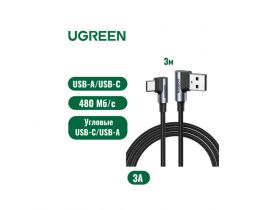 Кабель UGREEN US176 USB-A 2.0 угловой (90) to Type C угловой (90) 3A в оплетке 3 м, цвет черный (70875) 4406121156
