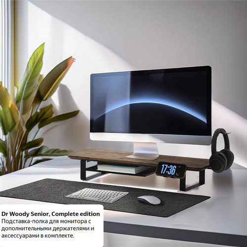 Настольная подставка для монитора Dr Woody Complete Edition уже включает в себя дополнительные аксессуары к полке.