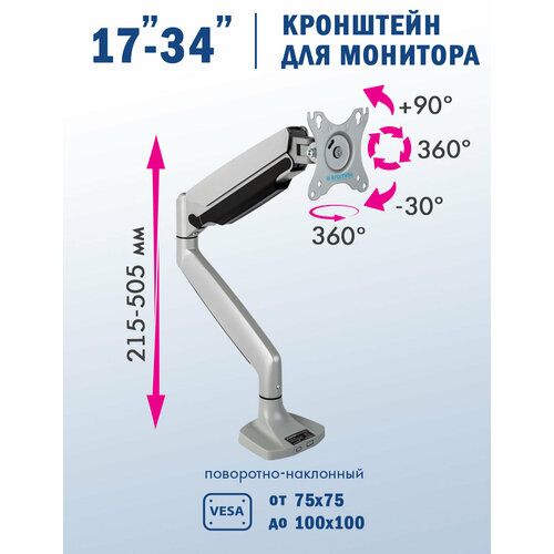 Дополнительно: Система легкой регулировки 3D Motion System специальный сферический шарнир позволяет легко и точно регулировать положение мониторов, Вращения экрана на 360° возможность размещения мониторов, как в вертикальном, так и в горизонтальном положении, Вертикальное перемещение в пределах 270 mm, Газовая пружина GAS SPRING Обеспечивает плавное движение монитора вверх и вниз, а так же делает возможность фиксировать монитор в любом промежуточном положении, Два способа крепления к столу