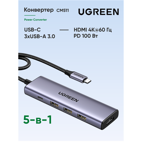 Конвертер UGREEN CM511 (15596) USB-C To HDMI+3*USB 3.0 A+PD Power Converter - Silver - это многофункциональное устройство, которое объединяет в себе функции USB-хаба и преобразователя.