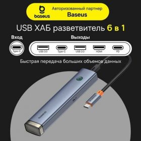 USB-Хаб Baseus UltraJoy Series 6-портов оснащен 6 портами различных типов, включая USB 2.0, USB 3.0, USB Type-C и USB Type-C PD. Это позволяет подключать различные устройства, включая компьютеры, смартфоны, планшеты и другие аксессуары.