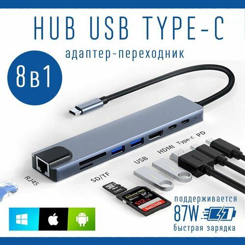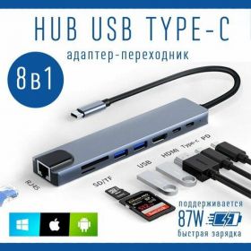 Найти - Hub USB type C 8 in 1 / Переходник HDMI 4K, RJ45, MicroSD, USBx2, TypeC Power Delivery 87W / Разветвитель хаб 3.0 8 в 1