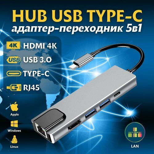 Найти - Хаб/Концентратор USB-C HUB 5 в 1/Переходник с USB 3.0, RJ45, HDMI 4K, PD Зарядка до 100W для MacBook Pro/Air