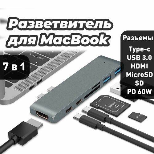 Найти - USB разветвитель для Macbook 7 в 1 Hdmi 4K, Usb 3.0, SD, TF, MicroSD, Thunderbolt 4, PD