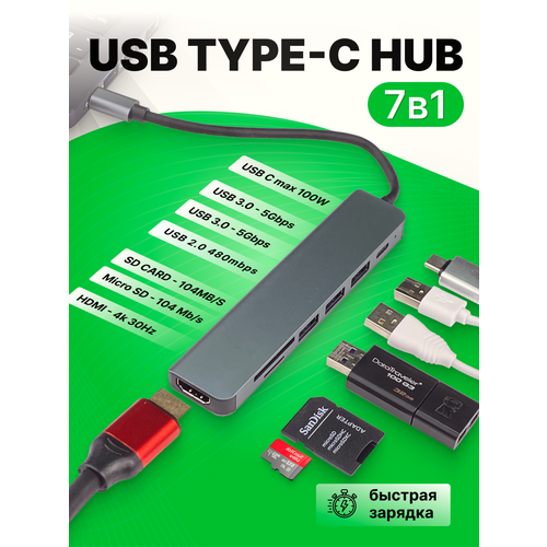 Найти - Переходник - разветвитель USB HUB 7 в 1 Type-C, SD Card, Micro SD, TF Card серебристый