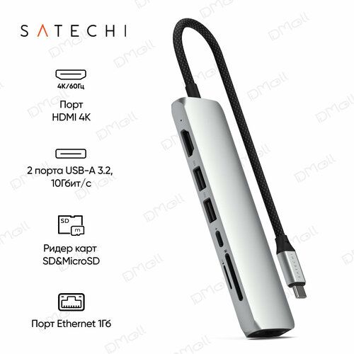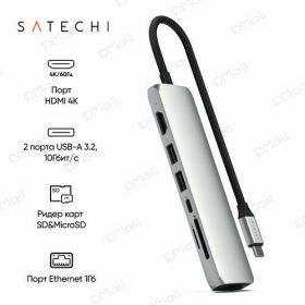 Найти - Адаптер Satechi 7-in-1 1хUSB-C&2xUSB-A3.2 Gen2&HDMI 4K@60Hz&Ethernet 1 Gigabitµ/SD Card Reader Slim Multiport Adapter with Ethernet. Цвет: серебристый