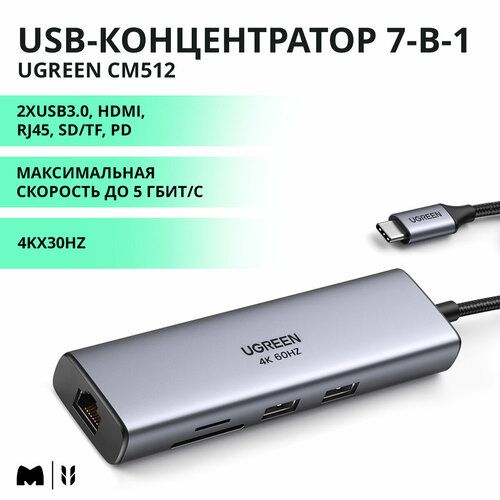 Найти - USB-концентратор UGREEN CM512 USB-C to 2хUSB3.0, HDMI, RJ45, SD/TF, PD Port Converter, цвет серый (90568)