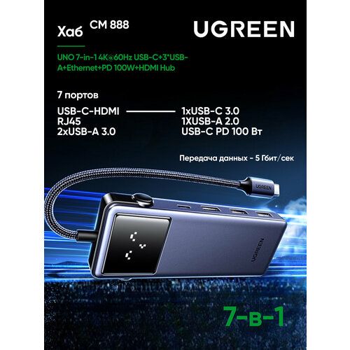 Хаб UGREEN CM888 (45155) UNO 7-in-1 4K@60Hz USB-C+3*USB-A+Ethernet+PD 100W+HDMI Hub для удобного подключения нескольких устройств к вашему компьютеру или ноутбуку.