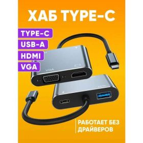 Type-C HUB 4в1 HDMI+VGA+USB 3.0+USB C - это многофункциональное устройство, которое обеспечивает расширенные возможности подключения для устройств с разъемом USB Type-C.