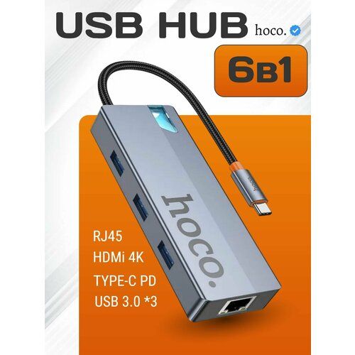 Найти - USB Hub Переходник HOCO HB51 6в1 (HDTV+RJ45+PD+USB3.0*3)