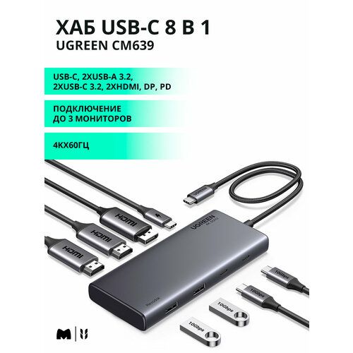 Найти - USB-концентратор (хаб) UGREEN CM639 (35625) 8 в 1: 4Kх60Гц, USB-C - 2хUSB-A 3.2+2хUSB-C 3.2+2хHDMI+DP+PD, цвет серый (35625)