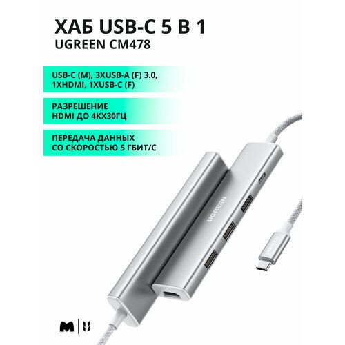 Хаб UGREEN CM478 — это многофункциональный USB-C хаб, оснащен разъемом питания USB-C, портом HDMI 4K и тремя портами USB-A 3.0, предоставляя дополнительные порты и возможности подключения.