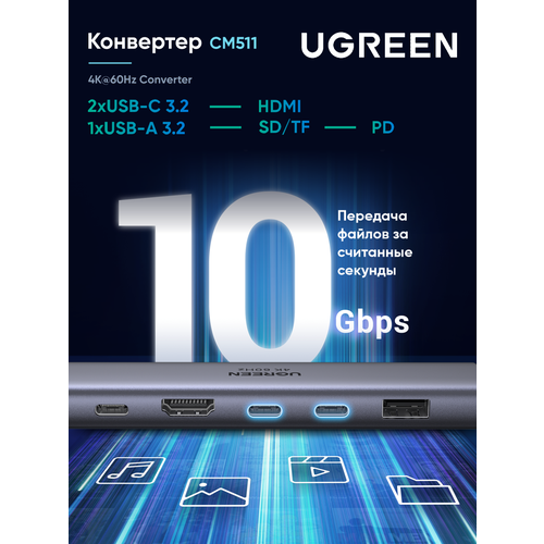 Конвертер UGREEN CM511 (45521) 7-in-1 4K@60Hz USB-C To HDMI+2xUSB-C 3.2+1xUSB-A 3.2+SD/TF+PD Converter - это высококачественный и функциональный USB-конвертер, который обеспечивает множество возможностей подключения и передачи данных.
