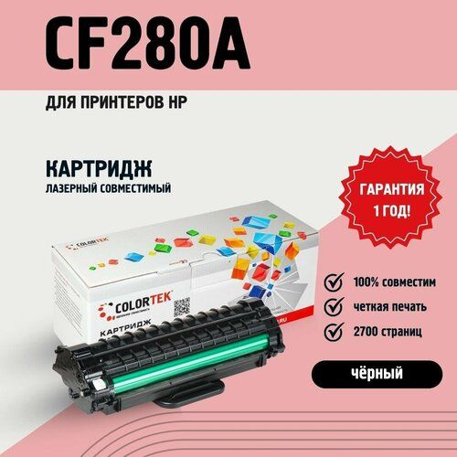 Совместимый лазерный картридж Colortek CF280A (80A) для принтеров HP LaserJet Pro M401, HP LaserJet Pro M425Цвет: черный. Технология печати: лазерная. Ресурс картриджа: не менее 2 700 страниц