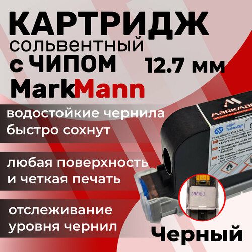 Картридж сольвентный MarkMann с чипом - это надежный и высококачественный продукт для ручного каплеструйного маркиратора типоразмера 2588, 2588+. Картридж заправлен сольвентными чернилами черного цвета, которые обеспечивают высокую четкость и контрастность печати на любой поверхности, наличие чипа позволяет отслеживать уровень чернил.