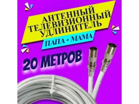 Антенный удлинитель коаксиальный 20 метров. Шнур для телевизора. ТВ штекер - ТВ розетка (ТВ гнездо) "Папа" - "мама". Антенный телевизионный кабель RG-6U 103796892090
