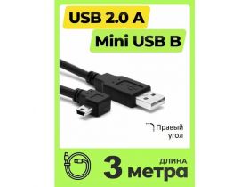 Кабель USB - mini USB (3 метра, 300 см) угловой для зарядки черный, правый угол, питание и передача данных, папа папа 4463844117