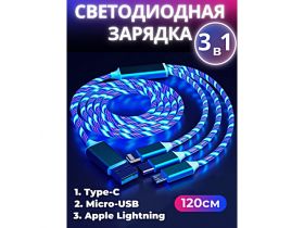Зарядный кабель светящийся 3 в 1, Зарядный кабель с подсветкой и 3 разъемами MicroUSB, Type-C, Lightning, 120см, Синий 103653138665