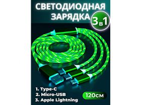 Зарядный кабель светящийся 3 в 1, Зарядный кабель с подсветкой и 3 разъемами MicroUSB, Type-C, Lightning, 120см, Зеленый 103714322634