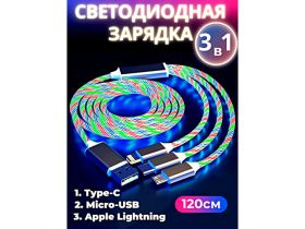 Зарядный кабель светящийся 3 в 1, Зарядный кабель с подсветкой и 3 разъемами MicroUSB, Type-C, Lightning, 120см, цветной 103698462247
