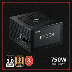 Блок питания, XPG, KYBER, KYBER750G-BKCEU, 750W, ATX, 80 Plus Gold, 20+4 pin, 1*4+4 pin, 5*Sata, 2*Molex, 2*PCI-E 6+2 pin, Non-modular, Вентилятор 12 см, Чёрный