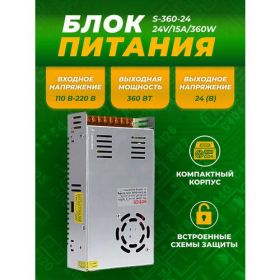 Блок питания S-360-24 24V/15A/360W подходит для светодиодного освещения, световых лент, ламп, модулей световых коробов и светящихся символов. Блок питания также обладает защитой от перегрузки, перенапряжения, перегрузки по току и короткого замыкания. Он имеет широкий диапазон входного напряжения от 110 до 220 В, что позволяет использовать его в разных странах и регионах.