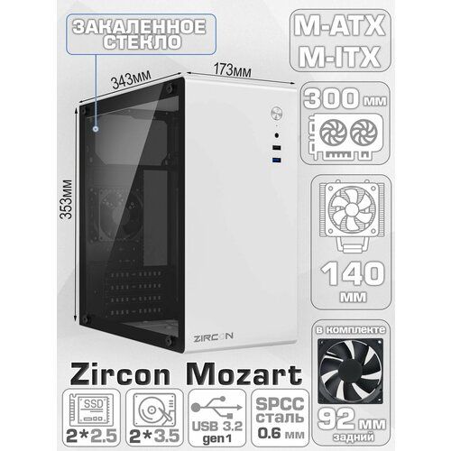 Найти - Корпус для ПК Zircon Mozart WT без БП (Белый Midi-Tower Micro-ATX Mini-ITX CPU 140мм VGA 300мм Закаленное стекло 1*USB3.0, 1*USB2.0, 1*92мм)