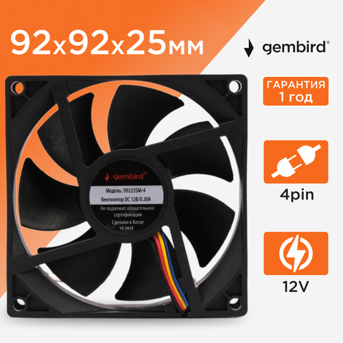 [Вентилятор] Gembird Вентилятор для корпуса 92x92x25, втулка, 4 pin, провод 30 см (D9225SM-4)