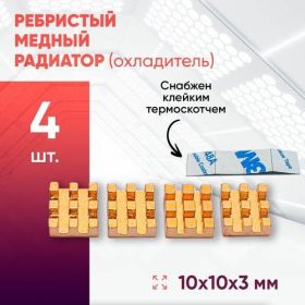 Ребристый медный радиатор для пассивного охлаждения чипов различной электроники и микросхем, размером 10*10*3 мм. В комплекте 4 штуки. Каждый любитель радиотехники задается вопросом, чем приклеить радиатор к микрокомпоненту или радиодетали без термоклея? В нашем варианте термоклей не используется. Представляем Вашему вниманию радиаторы самоклеящиеся, прилегающая поверхность снабжена двусторонним термоскотчем 3М 9448А, обеспечивающим легкую и быструю фиксацию радиатора на изделии. Многие пользователи сталкиваются с выбором, установить медный радиатор или алюминиевый? Ответ на этот вопрос есть: у меди на ~40% выше теплопроводность, чем у алюминия, но теплоемкость на ~60% ниже, медь хорошо снимает тепло, но посредственно передает тепло воздуху, поэтому если охлаждение пассивное то нужно использовать алюминий, а если активное то медь. Медные радиаторы являются устройством распределения тепла, обеспечивая эффективное охлаждение электронных компонентов. Характеристики термо скотча 3M 9448A: • Теплопроводность: 1.2Вт/м-к • Толщина: 0.15мм • Клей: акриловый клей, термопроводящий керамический порошок • Рабочая температура: -20 ~ 120 градусов