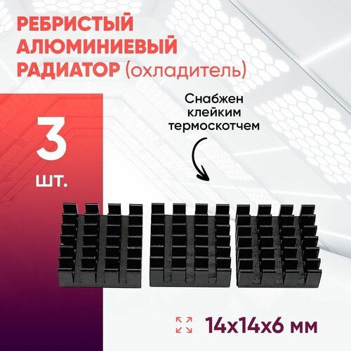 Ребристый алюминиевый радиатор для пассивного охлаждения чипов различной электроники и микросхем, размером 14*14*6 мм. В комплекте 3 или 5 штук (в зависимости от выбранной комплектации). Каждый любитель радиотехники задается вопросом, чем приклеить радиатор к микрокомпоненту или радиодетали без термоклея? В нашем варианте термоклей не используется. Представляем Вашему вниманию радиаторы самоклеящиеся, прилегающая поверхность снабжена двусторонним термоскотчем 3М 9448А, обеспечивающим легкую и быструю фиксацию радиатора на изделии. Многие пользователи сталкиваются с выбором, установить медный радиатор или алюминиевый? Ответ на этот вопрос есть: у меди на ~40% выше теплопроводность, чем у алюминия, но теплоемкость на ~60% ниже, медь хорошо снимает тепло, но посредственно передает тепло воздуху, поэтому если охлаждение пассивное то нужно использовать алюминий, а если активное то медь. Алюминиевые радиаторы являются устройством распределения тепла, обеспечивая эффективное охлаждение электронных компонентов. Характеристики термо скотча 3M 9448A: • Теплопроводность: 1.2Вт/м-к • Толщина: 0.15мм • Клей: акриловый клей, термопроводящий керамический порошок • Рабочая температура: -20 ~ 120 градусов