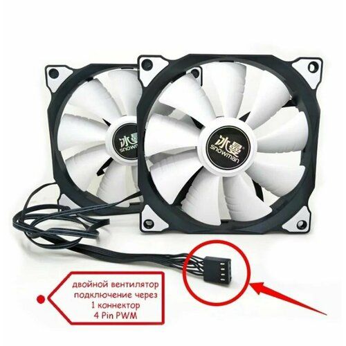 Два вентилятора, соединённые через 1 кабель 4 pin. Очень удобно, подходит как для корпуса компьютера, так и для радиатора охлаждения процессора с двумя местами под установку вентиляторов 120 мм. Отличное решение, если на вашей материнской плате мало разъёмов для подключения вентиляторов. Вентиляторы SNOWMAN отлично подходят для охлаждения корпуса вашего компьютера, радиатора процессора или же радиатора жидкостного охлаждения. Отлично рассеивают тепло, имеют низкий уровень шума, а система гидродинамического подшипника на данных вентиляторах имеет огромный запас прочности. Мягкие антивибрационные накладки исключают малейшие вибрации в процессе эксплуатации, а 4-pin коннектор обеспечит плавную регулировку оборотов.