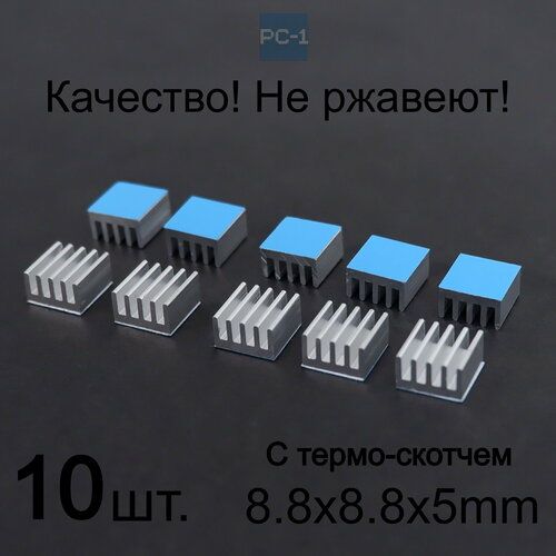 Найти - 10шт. 8.8x8.8x5mm Самоклеящийся Радиатор охлаждения для чипов и микросхем электроники с термоскотчем. Алюминиевый. Серебристый
