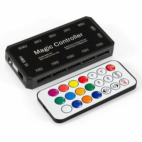 Контроллер управления ARGB вентиляторами для корпуса ПК с пультом. К контроллеру можно подключить до 10 вентиляторов 6 pin и 2 светодиодных лент. Управление цветом, яркостью и скоростью вращения вентиляторов. Внутри корпуса ПК контроллер крепится на двухсторонний скотч (в комплекте).