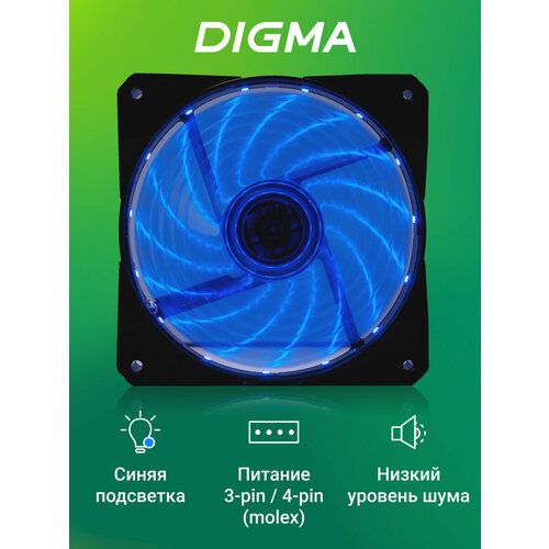 Вентилятор Digma DFAN-LED-BLUE 120x120x25мм, диаметр вентилятора 120мм, уровень шума до 23dB, вес 115гр, LED подсветка, Ret