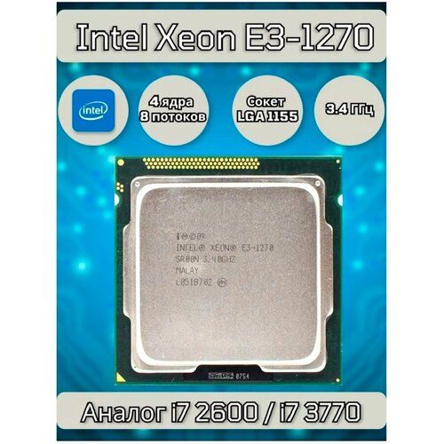 Процессор Intel Xeon E3-1270 - 4 ядра, 8 потоков. Базовая тактовая частота 3400 Мгц (3.4 Ггц). Частота в режиме Turbo Boost - 3800 Мгц (3.8 Ггц). L3 Кеш - 8192 кб (8 мб). Относится к поколению процессоров Intel Core - Sandy Bridge. Тех. процесс 32 нм. Совместим с материнскими платами с сокетом LGA1155 (в редких случаях может потребоваться обновление биос). По мощности и производительности является аналогом Intel Core i7 2600 или (с небольшим отставанием) Core i7 3770. Отличный вариант, чтобы собрать недорогой и мощный игровой компьютер, компьютер для учебы, компьютер для дома, компьютер в офис. Отличный подарок геймеру, подарок программисту. На сегодняшний день производительности данного процессора хватает, чтобы справиться с широким спектром задач, это отличный процессор для игр, для обработки видео, для программирования. Оптимальное соотношение цены и качества. Важно - совместим только с сокетом LGA1155, в редких случаях может потребоваться обновление BIOS.