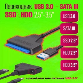 Название товара: Адаптер/Переходник/Кабель с USB 3.0 на SATA III (HDD/SSD)Описание товара: Высококачественный SATA адаптер, предназначенный для подключения жестких дисков по протоколу USB. Благодаря интерфейсам USB 3.0 и SATA 6.0, а также версии SATA III, вы можете легко и быстро подключить жесткий диск к вашему компьютеру или ноутбуку.