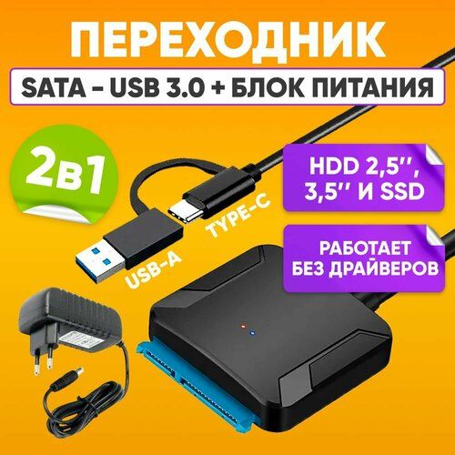 Переходник USB 3.0 на SATA 3 (7+15pin 22pin) кабель адаптер для HDD/SSD жестких дисков. Кабель SATA USB 3.0 для HDD 3,5-2,5 SSD с блоком питания 2в1 - USB-A подключение или Type-C подключение. Адаптер позволяет подключать как маленькие накопители (SSD или HDD 2.5 от ноутбуков), так и большие HDD 3.5. Совместим с: Windows, Mac OS, Chrome OS, Linux; приставками PS4, PS3, Xbox One, Smart TV. Для дополнительного питания подойдёт адаптер 12v (2А и более) со штекером 5.5 * 2.1. Высококачественный адаптер, позволяет подключить жесткий диск напрямую к ПК. В комплекте идет адаптер питания, который подключается в розетку. Он нужен, если вы подключаете HDD 3.5. Жесткий диск будет определяться, как флешка. Поддержка скорости до 5 Гбит/с. Обратная совместимость с юсб 2,0/1,1. Поддержка всех 2,5 "/3,5" SATA HDD/SDD. Коннектор подключается без установки драйверов. Концентратор часто используют для подключения старого жесткого от ноутбука, когда его меняют на новый SSD диск.