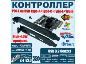 Контроллер PCI-E, USB 3.2 Gen2x1 1xUSB-A, 1xUSB-C, 1xType-E, 19pin, модель PCIeU32TE, Espada 18951085