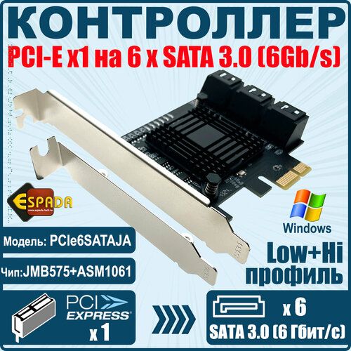 Контроллер PCI-E, SATA3 6port, чип JMB575 + ASM1061, модель PCIe6SATAJA, Espada