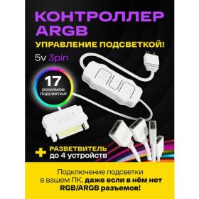 ARGB контроллер, это устройство, которое позволяет управлять подсветкой внутри системного блока компьютера. С помощью этого девайса вы сможете выбирать режимы анимации подсветки кулера/вентилятора, светодиодной ленты, радиаторов и других устройств, поддерживающих 5V 3pin ARGB подсветку. С помощью специального разветвителя идущего в комплекте, контроллер ARGB способен синхронизировать подсветку всех устройств ARGB в Вашем компьютере.