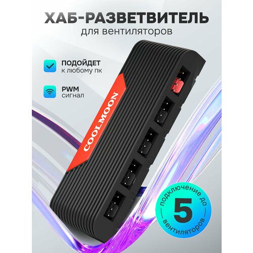 Хаб-разветвитель COOLMOON на 5 вентиляторов (кулеров) - это специализированный контроллер, который позволяет одновременно подключить до 5 вентиляторов.