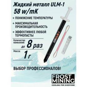 Жидкий металл FrostMining Ultimate Liquid Metal 58(Вт/мК) не содержит неметаллических добавок (например, силикона, оксидов и т. д.). Благодаря этим свойствам, ULM-1 превосходит лучшие высоко теплопроводные термопасты. Обратите внимание, при нанесении жидкого металла на интерфейсы - не допускайте попадания на контакты и алюминиевые элементы.
