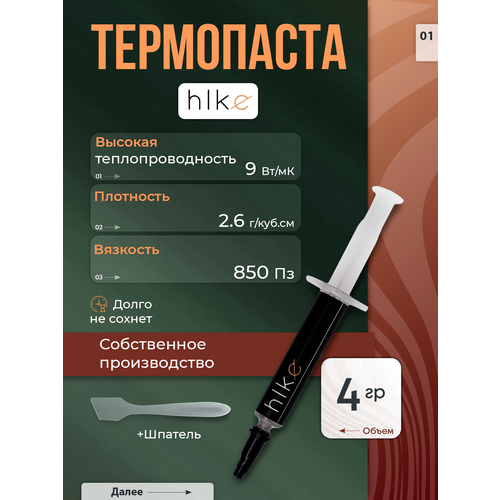 Термопаста hike T-1 4 грамма изготовлена из проверенных материалов с высокой теплопроводностью, обеспечивающих эффективное охлаждение. Вязкость 85 Пас позволяет легко наносить, после нанесения имеет долгий срок службы. Является диэлектриком, поэтому соприкосновение с любыми электрическими контактами не приведет к каким-либо повреждениям. Тонкий слой термопасты T-1 полностью заполняет все микронеровности и шероховатости, обеспечивая максимально возможную площадь соприкосновения радиатора и процессора. При помощи шпателя в комплекте удобно наносить термопасту ровным тонким слоем. Подходит для компьютера, ноутбука, процессора, видеокарты, игровой приставки и других устройств. Технические характеристики: масса термопасты: 4 грамма; теплопроводность: 9 Вт/(мК); вязкость при 20 С: 85 Пас; диапазон рабочих температур: от -60 С до +210 С. Комплектация: термопаста hike T-1 4 грамма в шприце, шпатель для нанесения термопасты, надежная упаковка с замком зип лок.