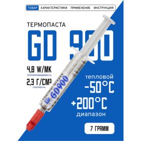 Термопаста GD900 (термопроводящая паста, теплопроводная паста) подходит для процессора, для ноутбука, для компьютера, для пк (системного блока), для игровой приставки, а также для видеокарты. Полноценно используется как теплоинтерфейс между радиатором и светодиодом, может без ограничения использоваться для охлаждения компьютерных компонентов, таких как процессоры, микросхемы памяти, видеочипы (видеокарта), микросхемы мостов материнских плат. Термопаста в шприце вес 7 грамм, теплопроводность 4,8 Вт/мК. Термопаста с 20% силиконовой жидкостью окисью металла, паста стабильна при высоких температурах. Плотность: 2.3 г/см3. Диапазон рабочих температур от -50 до +200 C. GD900 долго не высыхает, сохраняя свои уникальные свойства в течение длительного времени.