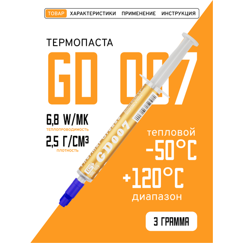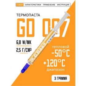 Термопаста, GD007(теплопроводящая паста, термоинтерфейс), имеет высокое качество, обеспечивает отличный теплообмен между поверхностями до 6,8W/m-K (например между крышкой процессора и радиатором охлаждения). Паста стабильно сохраняет консистенцию на протяжении всего срока работы, обеспечивая стабильный отвод тепла.