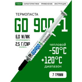 Термопаста, GD900-1(теплопроводящая паста, термоинтерфейс), имеет высокое качество, обеспечивает отличный теплообмен между поверхностями до 6,0W/m-K (например между крышкой процессора и радиатором охлаждения). Паста стабильно сохраняет консистенцию на протяжении всего срока работы, обеспечивая стабильный отвод тепла.