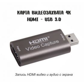 Карта видеозахвата USB 3.0 записывает видео и аудио с разных источников сигнала – видеокамер, вебкамер, ТВ приставок, фотоаппаратов, телевизоров, игровых приставок и других устройств с выходом HDMI. Устройство видеозахвата сделано в компактном и прочном корпусе, а также отличается простотой и удобством использования. Для подключения карта оснащена с одной стороны классическим входом HDMI, а с другой – разъемом USB3.0.
