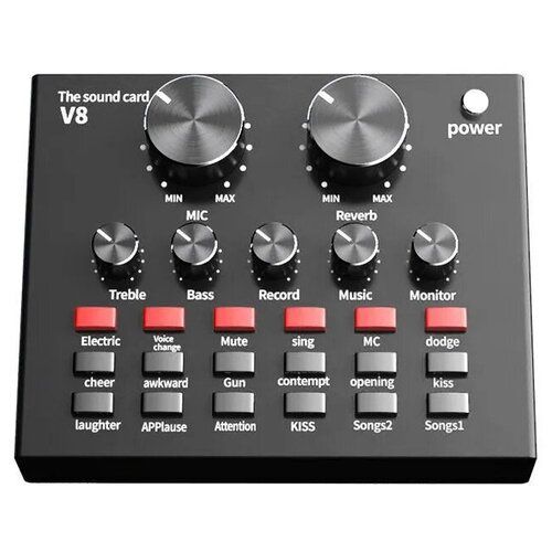 Внешняя звуковая карта V8 (Микшерный пульт) используется для игры на музыкальных инструментах, записи вокала, караоке или стримов. Работает на базе чипа AP8248, эффективно усиливает звук до 35 dB. Система поддерживает одновременное подключение сразу нескольких устройств: наушников, телефонов, микрофонов. На корпусе есть регуляторы, с помощью которых можно выставить нужную громкость, активировать различные звуковые эффекты: басы, эхо, биты и т. д. Девайс обеспечивает объемное звучание на 360 градусов в радиусе 8 м. Питается от встроенного аккумулятора емкостью 1200 мАч. Усиление микрофона: от 12dB до 35dB. Выходы: -Jack 6.3mm для подключения микрофона -Jack 3.5mm для подключения микрофона -Jack 3.5mm под наушники с микрофоном -Jack 3.5mm под простые наушники -MicroUSB порт для подключения к компьютеру, блоку питания для подзарядки. -MicroUSB порт для подключения внешних звуковых устройств (синтезатор, Midi контроллер) -MicroUSB порт (X2) для передачи звука с мобильных устройств через Jack 3.5mm Возможности регулировки: -Громкость микрофона - Высокие частоты микрофона - Низкие частоты микрофона - Ревербирация (эхо) - Громкости записи - Громкости воспроизведения внешних звуковых устройств. - Общая громкость. 12 дополнительных звуков Режимы изменения голоса (смена режима производится коротким нажатием кнопки режима) -Autotune:12 видов изменений голоса - Pitch: детский голос, грубый голос - Shock-Wave: грубый голос - MC: усиление микрофона - Silence: приглушение микрофона - Doodge Размеры: 13х10,5х4см Дополнительно: встроенный аккумулятор, возможность подключения к компьютеру в качестве внешней звуковой карты. Комплектация: звуковая карта, кабель USB- MicroUSB, кабель MicroUSB- Jack 3.5mm, инструкция на английском языке. Хорошо подойдет для проведения стримов, игры на музыкальных инструментах с одновременной записью вокала, караоке, проведения утренников и иных развлекательных мероприятий