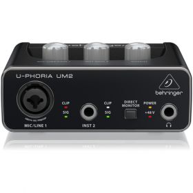 U-PHORIA UM2 - недорогое компактное устройство, призванное обеспечить удобную и беспроблемную передачу аналогового сигнала на компьютер с операционной системой семейства Windows или Mac OS. Часто используемые при проектировании аудиотехники разъёмы обеспечивают универсальную совместимость с оборудованием любой студии, а качественный аналогово-цифровой преобразователь помогает добиться профессионального качества звука даже без дальнейшей программной обработки. Функционал U-PHORIA UM2 совместим со всеми типичными для звукозаписывающей студии или концертного зала устройствами - микрофонами, музыкальными инструментами, микшерами и другими приборами для коррекции аудио. В роли входных разъёмов выступают инструментальный ?-дюймовый джек и комбинированное микрофонно-инструментальное XLR/TRS-гнездо. Последнее оснащено встроенным XENYX-предусилителем для ясного и отчётливого считывания сигнала с микрофона. Каждый из входов оборудован двумя светодиодными индикаторами - наличия сигнала и клиппирования. Также на передней панели U-PHORIA UM2 находится гнездо для подключения наушников - стандартный ?-дюймовый выход, переключатель функции прямого мониторинга входного сигнала и индикаторы подачи питания на устройство и подачи фантомного питания на микрофонный вход. Сам переключатель фантомного питания 48 В расположен на задней панели корпуса. Там же находятся RCA-выходы для подсоединения аналоговой аудиотехники, например, динамиков или микшера, гнездо для замка Кенсингтона и USB-порт. USB-шина у U-PHORIA UM2 двухканальная, благодаря чему обеспечивается однозначное соответствие цифровых и аналоговых каналов. Технические нюансы U-PHORIA UM2 имеет мини-настольный форм-фактор. В качестве источника питания U-PHORIA UM2 использует USB-подключение. U-PHORIA UM2 требует для работы Windows-драйвера ASIO, установленные практически на каждом компьютере, используемом для редактирования аудио, либо интегрированные в Mac OS Core Audio. Интерфейс совместим со всем спектром популярного программного обеспечения для звукозаписи и редактирования аудио; кроме того, большой пакет приложений и плагинов для обработки доступен для свободного скачивания с сайта Behringer.